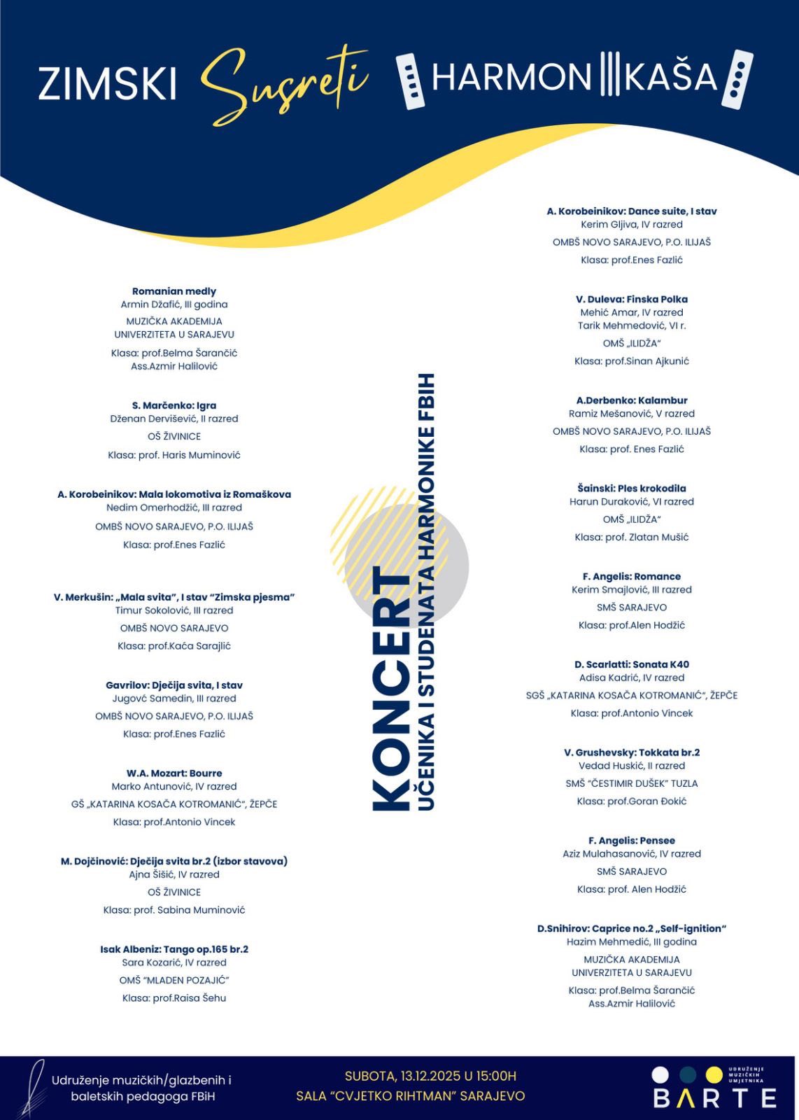 Dana 13.12.2025. godine, na Muzičkoj akademiji Univerziteta u Sarajevu su održani Zimski susreti harmonikaša na kojem su se predstavili učenici i studenti harmonike Federacije Bosne i Hercegovine. Našu školu je predstavila učenica Sara Kozarić (IV razred) iz klase profesorice Raise Šehu.